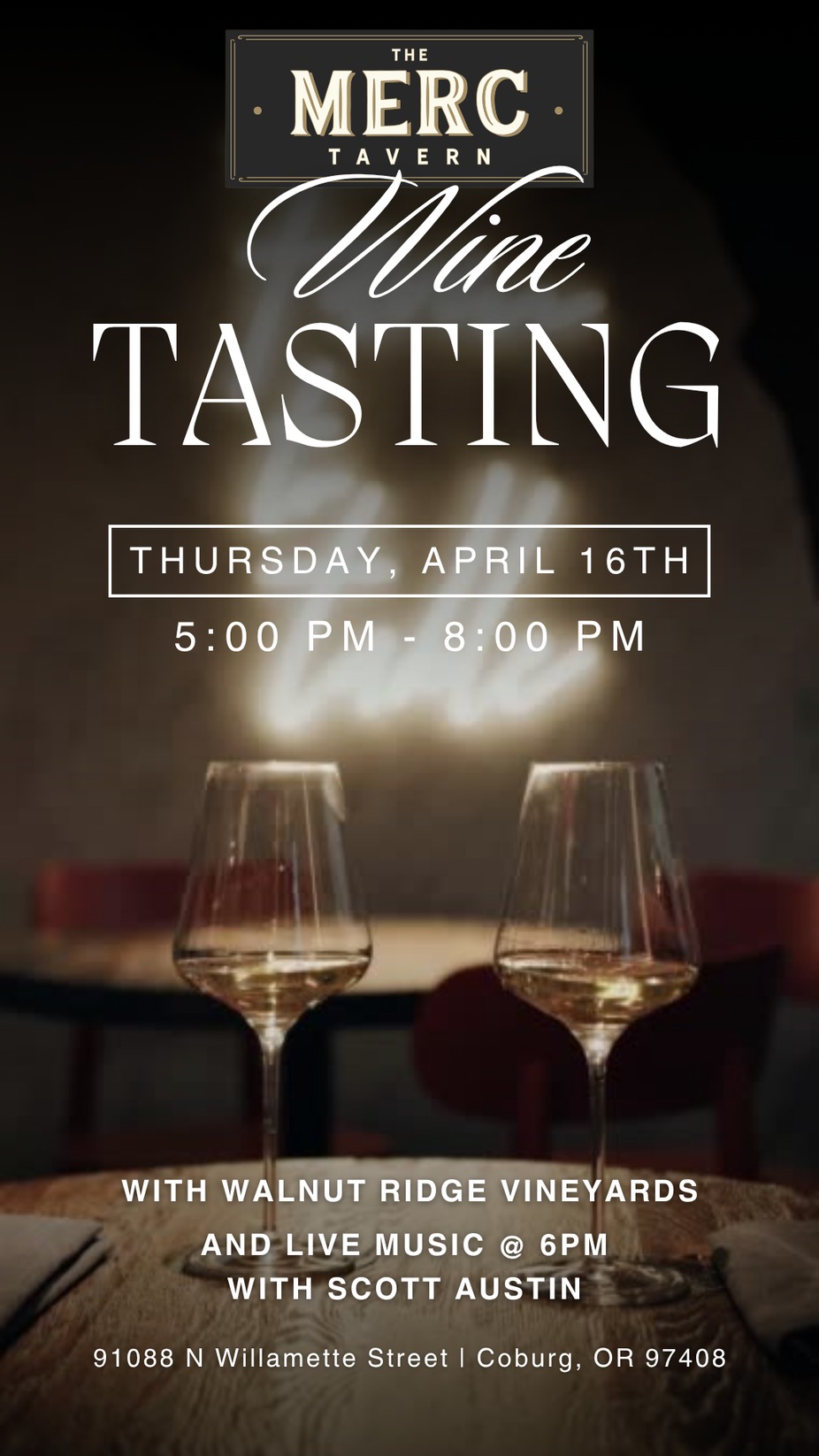 Join us at The Merc on Thursday, April 16th for an evening of great wine, live music, and small-town charm. We’re featuring a special wine tasting with selections from Walnut Ridge beginning at 5:00 PM, followed by live music from Scott Austin starting at 6:00 PM.
