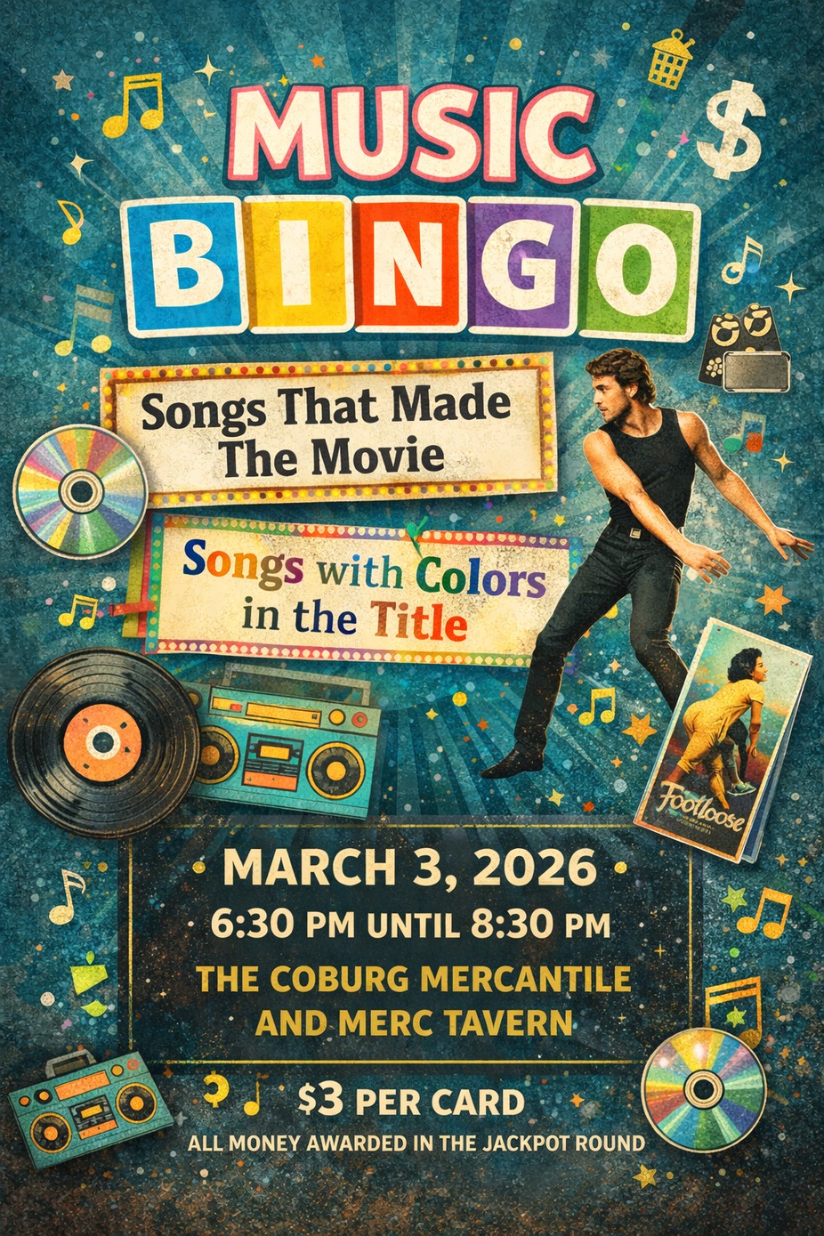 Lights, camera… bingo! Join us at The Merc Tavern for a special Music Bingo night featuring Songs That Made the Movie. From iconic soundtracks to unforgettable scenes you can hear the moment the music starts, this theme is all about the songs that turned great movies into legends.