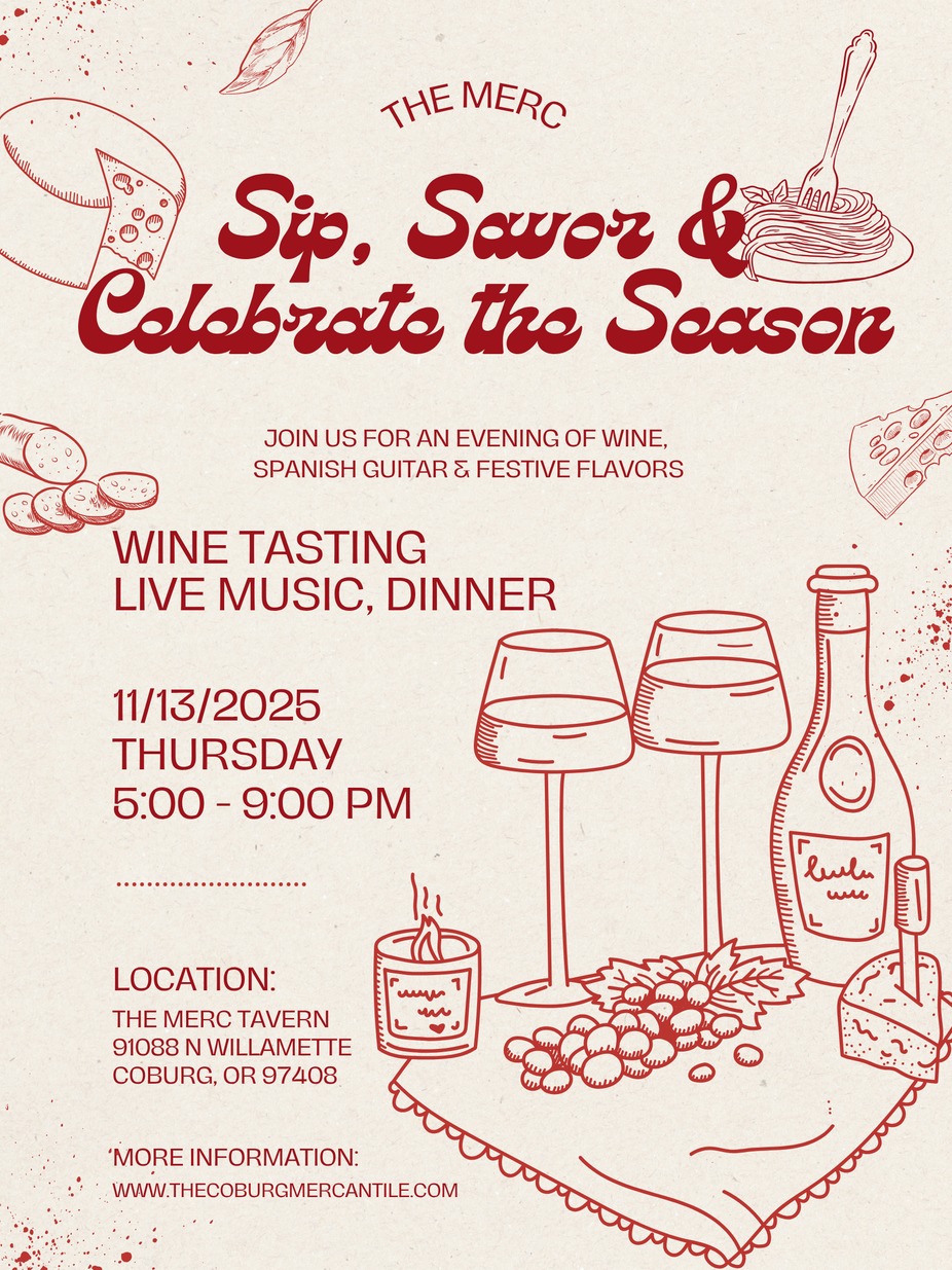 Join us for a festive evening of wine, flavorful food, and live music! Enjoy a special wine tasting experience with Walnut Ridge Winery, featuring a curated selection of local wines that pair beautifully with our new fall and holiday menu. Savor fresh seasonal dishes crafted to highlight the best flavors of the season. The evening’s ambiance will be set by the soothing sounds of Spanish guitarist Craig Einhorn, whose warm, melodic performance adds the perfect touch of elegance to this cozy celebration. Come raise a glass, unwind, and celebrate the joy of the season with friends at The Merc Tavern.